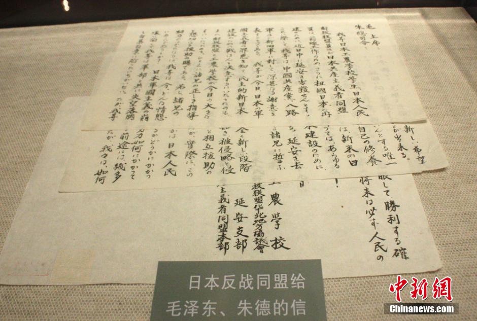 Letters to Mao Zedong and Zhu De from Japan's anti-war alliance are exhibited in the memorial. (CNS/Gu Hua)