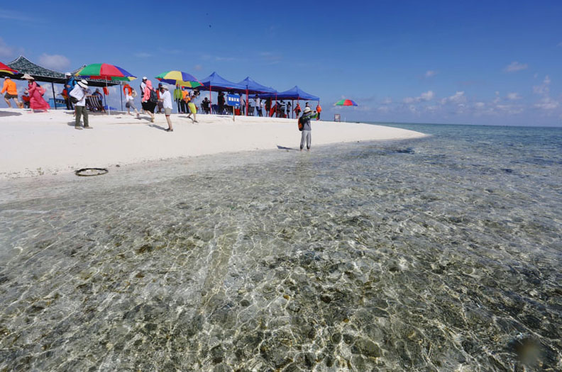 Tourists enjoy their visit to Yinyu, one of the Xisha Islands in South China's Hainan province. The first of more than 200 tourists visited the Xisha Islands after the route from Sanya went into operation. There is plenty for visitors to do during their stay, including beach volleyball, diving and sea fishing. [Photo/Xinhua] |