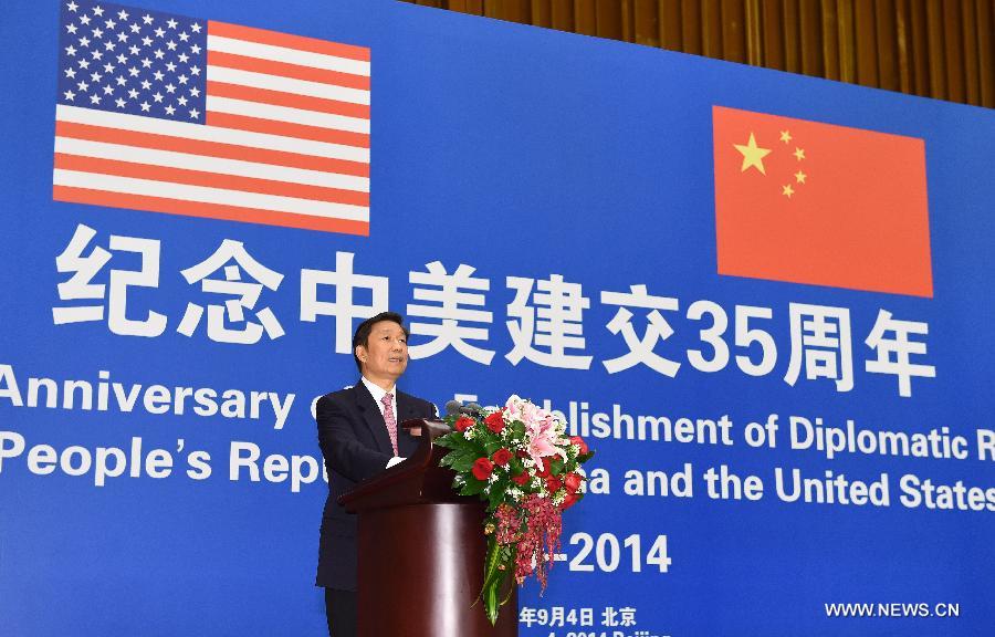 Chinese Vice President Li Yuanchao delivers a speech at a reception held to mark the 35th anniversary of the establishment of China-U.S. diplomatic relations in Beijing, China, Sept. 4, 2014. (Xinhua/Ma Zhancheng) |
