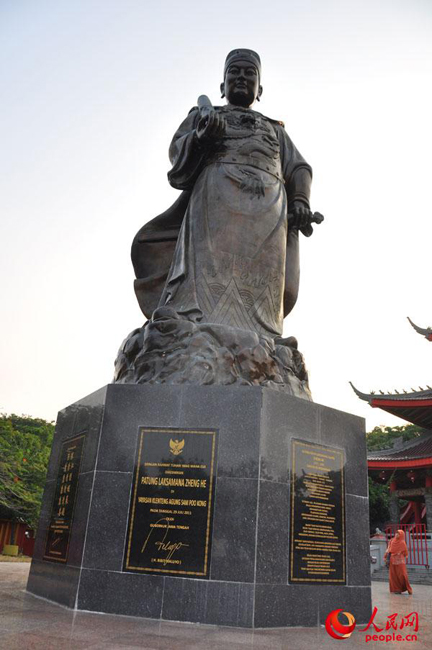 4.The 11-metre statue of Zheng He stands in the yard of Sam Po Kong. (People's Daily Online/Li Haixia)