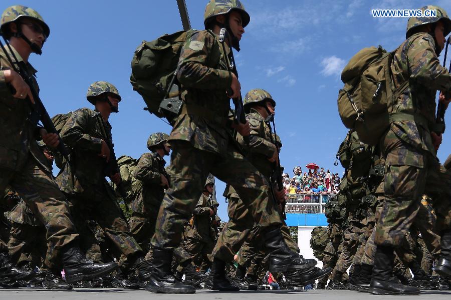 Soldiers take part in a military parade to commemorate the Independence's Day of Brazil, at the Anhembi Sambadrome, in Sao Paulo, Brazil, on Sept. 7, 2014. Brazil celebrated the 192th anniversary of its independence on Sunday. (Xinhua/Rahel Patrasso)
