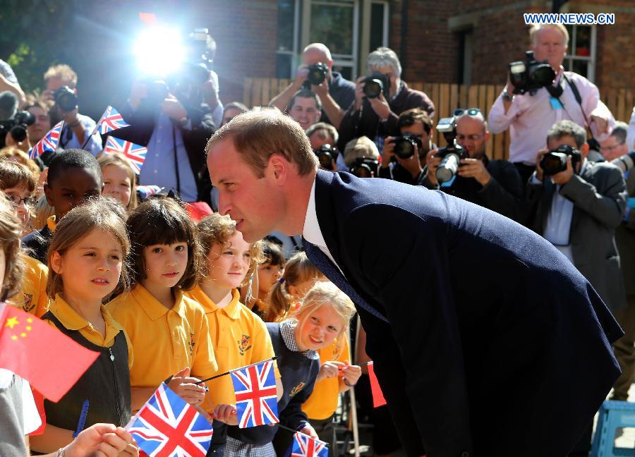 Prince William (R), Duke of Cambridge, speaks to school students as he arrives to formally inaugurate the Dickson Poon University of Oxford China Centre Building in Oxford, the United Kingdom, on Sept. 8, 2014. Prince William unveiled the Dickson Poon University of Oxford China Centre here on Monday. (Xinhua/Han Yan) |