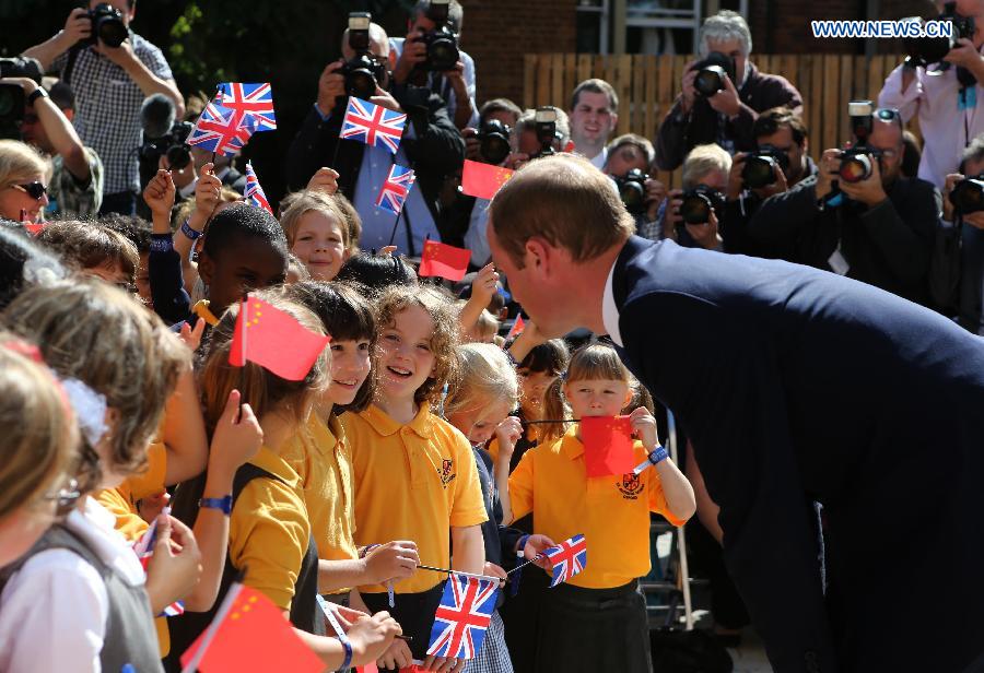 Prince William (R), Duke of Cambridge, speaks to school students as he arrives to formally inaugurate the Dickson Poon University of Oxford China Centre Building in Oxford, the United Kingdom, on Sept. 8, 2014. Prince William unveiled the Dickson Poon University of Oxford China Centre here on Monday. (Xinhua/Han Yan)