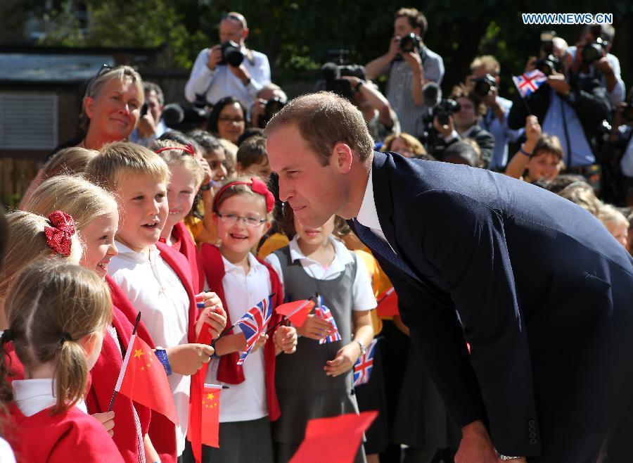 Prince William (R), Duke of Cambridge, speaks to school students as he arrives to formally inaugurate the Dickson Poon University of Oxford China Centre Building in Oxford, the United Kingdom, on Sept. 8, 2014. Prince William unveiled the Dickson Poon University of Oxford China Centre here on Monday. (Xinhua/Han Yan) |