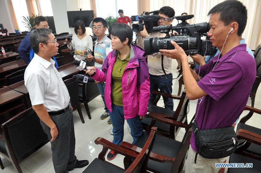 Head of the Jiemeifengyou Chemical Plant receives interview at a press conference in Yinchuan, capital of northwest China's Ningxia Hui Autonomous Region, Sept. 9, 2014. The ammonia gas leak accident that occured on Sunday afternoon injured 49 people, among whom 33 showed poisoning symptoms and four people were seriously poisoned. (Xinhua/Peng Zhaozhi) |