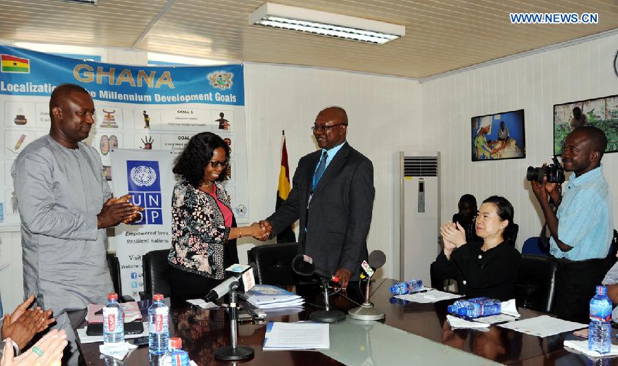 Resident Representative of the UNDP (United Nations Development Program ) Gita Welch (2nd L) shakes hands with Ghana's Executive Secretary of the Energy Commission Alfred Ofosu Ahenkorah (3rd L)after they signed a pact as Chinese Ambassador to Ghana Sun Baohong (2nd R) applauds, in Accra, Ghana, Sept. 8, 2014. A pact to boost transfer of renewable energy technology from China to Ghana was officially signed at a short ceremony here on Monday. The partnership is under the China-Ghana-South-South Cooperation on Renewable Energy Technology Transfer, with funding from the Danish government. (Xinhua/Lin Xiaowei) |