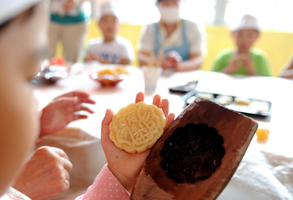 One child displays the moon cakes made with traditional molds. (Xinhua/Liu Junxi)