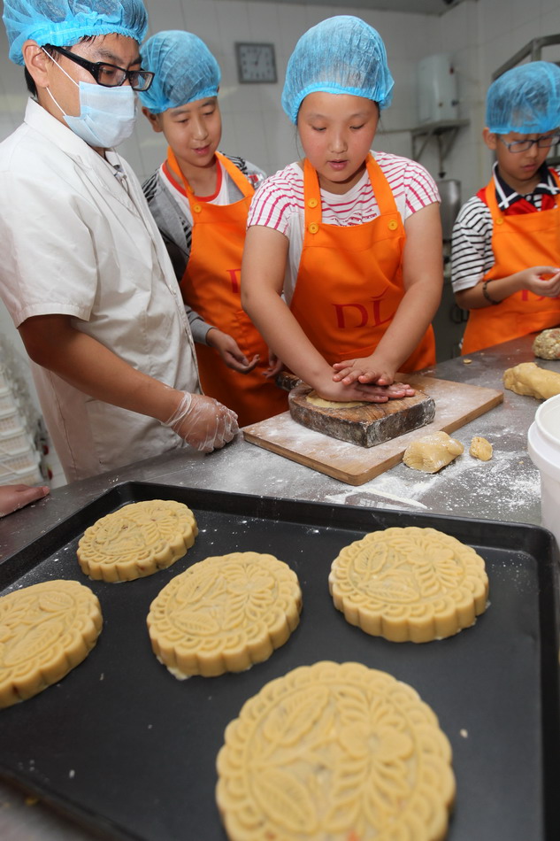 Students of Xuchang Guhuaijie Primary School learn how to make traditional moon cakes at a food-processing company. (Xinhua/Niu Shupei)