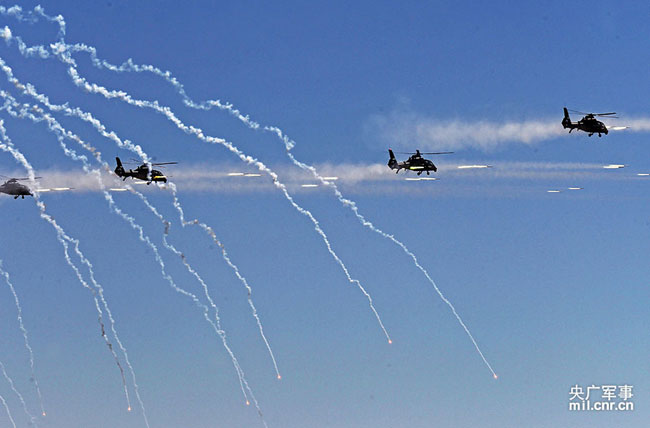 Helicopters launch accurate strikes on enemy’s ground targets in Peace Mission 2014, a joint anti-terror military drill conducted by forces of the Shanghai Cooperation Organization (SCO) countries. (Photo/mil.cnr.cn)