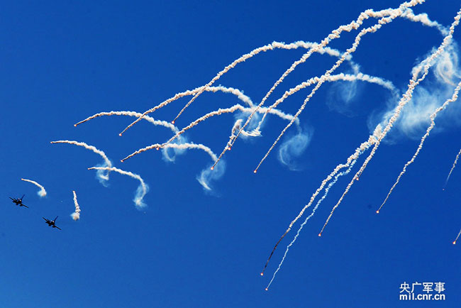 F–10 fighters release IR decoy flares to confuse the enemy in Peace Mission 2014, a joint anti-terror military drill conducted by forces of the Shanghai Cooperation Organization (SCO) countries. (Photo/mil.cnr.cn)