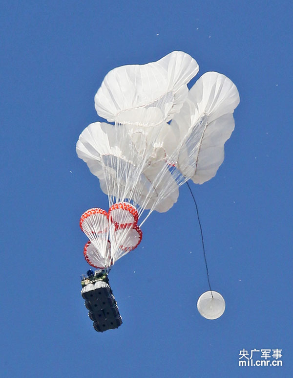A large Chinese military transport aircraft delivers an airborne fighting vehicle accurately to the frontline of Peace Mission 2014, a joint anti-terror military drill conducted by forces of the Shanghai Cooperation Organization (SCO) countries. (Photo/mil.cnr.cn) |