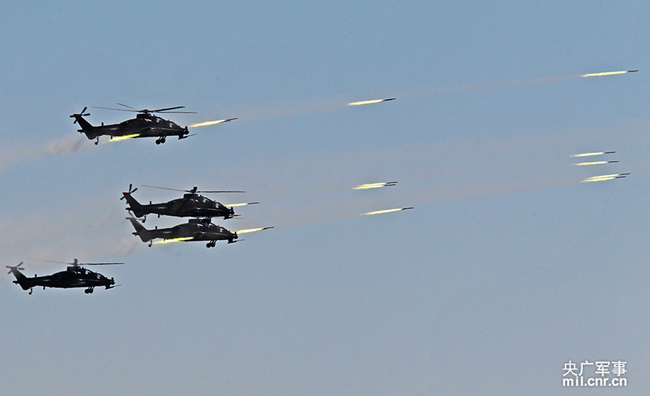 Helicopters launch accurate strikes on enemy’s ground targets in Peace Mission 2014, a joint anti-terror military drill conducted by forces of the Shanghai Cooperation Organization (SCO) countries. (Photo/mil.cnr.cn)