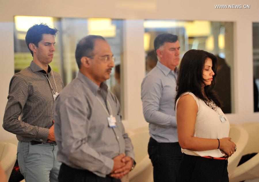 Participants practise Tai Chi with the guidance of Master Faye Yip from Britain's Deyin Tai Chi Institute during the 2014 New Leaders Meeting of the World Economic Forum, or the Summer Davos, in Tianjin, north China, Sept. 10, 2014. (Xinhua/Zhang Chenlin)