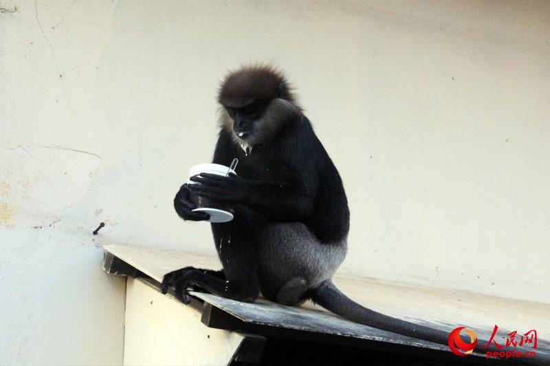 A monkey eats the ice-cream from tourist. (Photo/People's Daily Online)