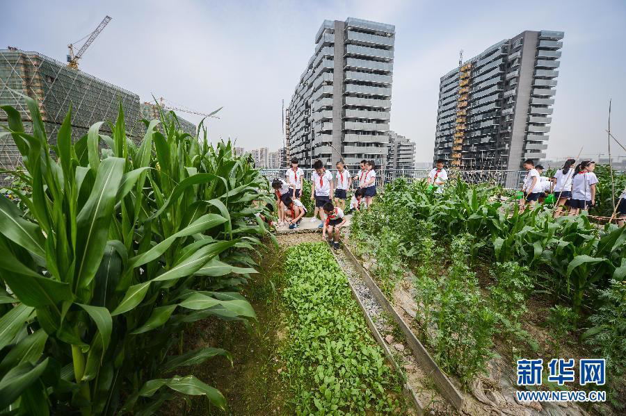 Students tend the vegetables in the roof garden of Hangzhou Xiayan Primary School in Hangzhou.(Xinhua/Xu Yu)