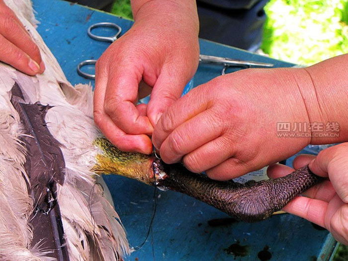 A policeman bandages wound for an injured black-necked crane, a first-class national protected animal. (www.scol.com.cn)