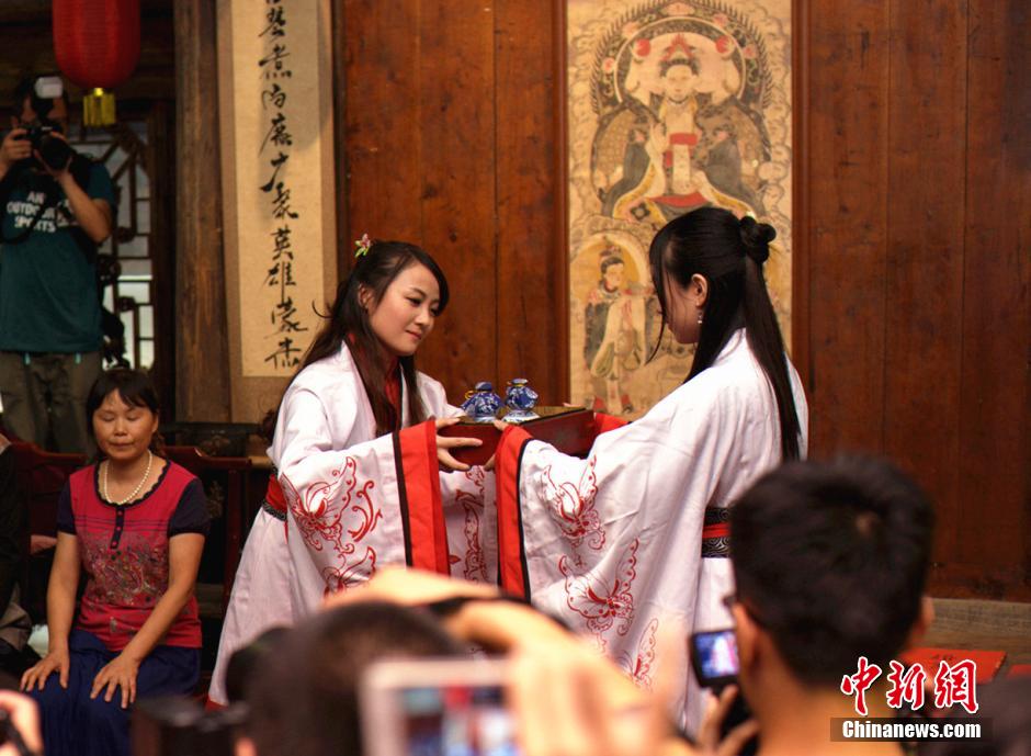 On Sept. 8, 2014, the Mid-Autumn Day, a young man proposes to his girlfriend in Ciqikou, an ancient town in southwest China’s Chongqing. Both of them love traditional culture and he decided to give his girlfriend a surprise by proposing to her in accordance with etiquette of Zhou Dynasty. (Chinanews.com/Liu Yu) |