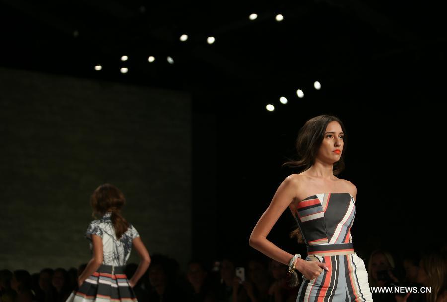 A model presents a creation of the Spring/Summer 2015 LUIS ANTONIO collection during the New York Fashion Week in New York, the United States, Sept. 6, 2014. (Xinhua/Qin Lang)