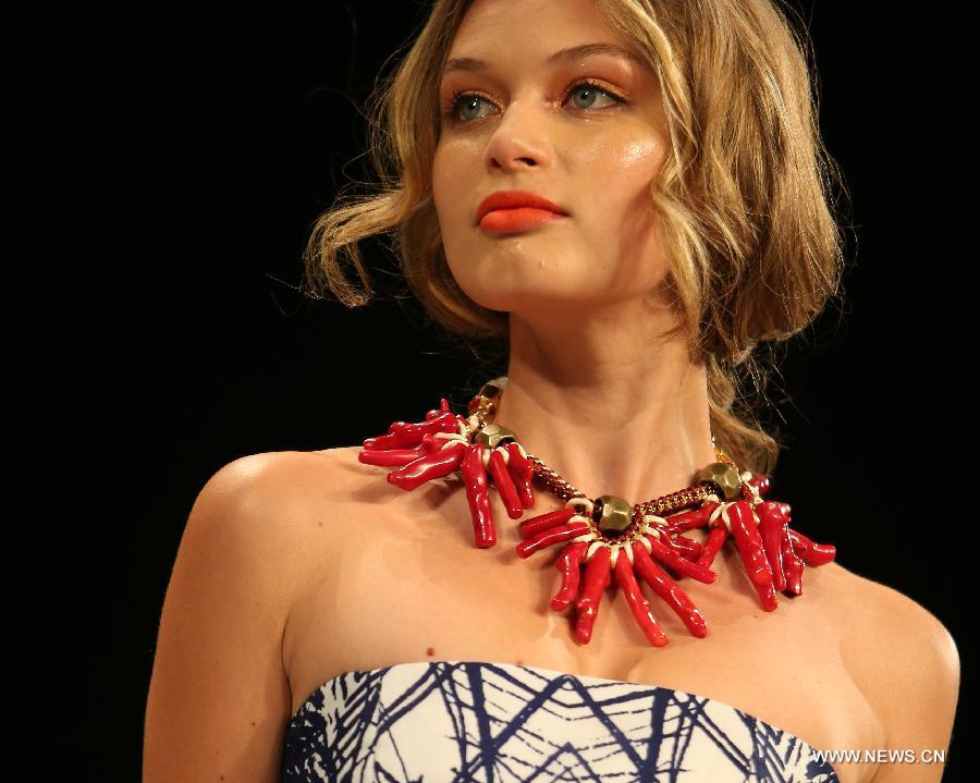 A model presents a creation of the Spring/Summer 2015 LUIS ANTONIO collection during the New York Fashion Week in New York, the United States, Sept. 6, 2014. (Xinhua/Qin Lang)