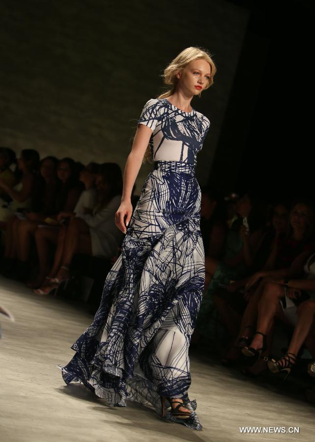 A model presents a creation of the Spring/Summer 2015 LUIS ANTONIO collection during the New York Fashion Week in New York, the United States, Sept. 6, 2014. (Xinhua/Qin Lang)
