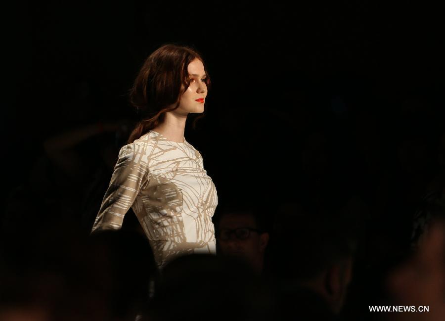 A model presents a creation of the Spring/Summer 2015 LUIS ANTONIO collection during the New York Fashion Week in New York, the United States, Sept. 6, 2014. (Xinhua/Qin Lang)