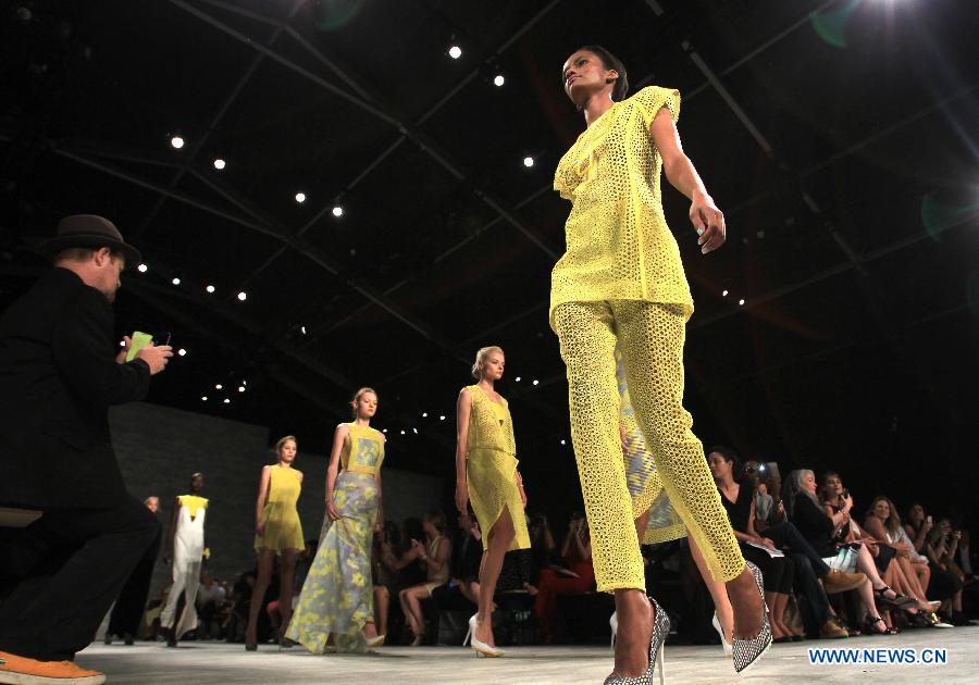 Models present creations of the Spring/Summer 2015 ANGEL SANCHEZ collection during the New York Fashion Week in New York, the United States, Sept. 8, 2014. (Xinhua/Cheng Li)
