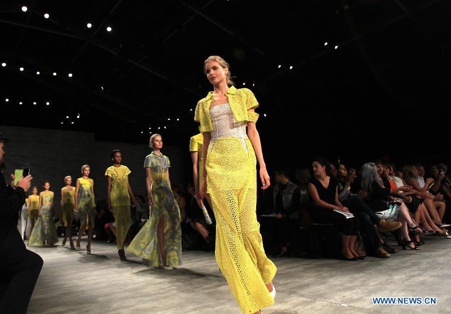 Models present creations of the Spring/Summer 2015 ANGEL SANCHEZ collection during the New York Fashion Week in New York, the United States, Sept. 8, 2014. (Xinhua/Cheng Li)