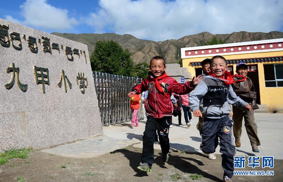 Students play at Jiujia Elementary School in Labrang town of Xiahe county, northwest China's Gansu province, Sept. 2, 2014. Jiujia Elementary School has 627 students; all of them are Tibetan. Teachers give classes in both Tibetan and Han languages. Besides having traditional classes such as mathematics and English, students can select a "dream class," which teaches Tibetan Guozhuang Dance and innovative paintings. (Xinhua News Agency/Li Mangmang)