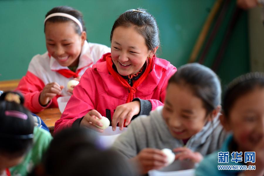 Students enjoy their nutritious meals during the break at Jiujia Elementary School in Labrang town of Xiahe county, northwest China's Gansu province on Sept. 2, 2014.(Xinhua News Agency/Li Mangmang)