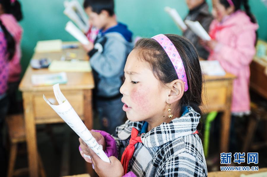 Students read the text in the Tibetan classes at Jiujia Elementary School in Labrang town of Xiahe county, northwest China's Gansu province on Sept. 2, 2014.(Xinhua News Agency/Zhang Meng)