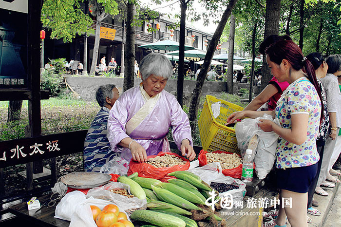 The old vegetable vendor is dressed in ancient costumes. (Photo/travel.china.com.cn)