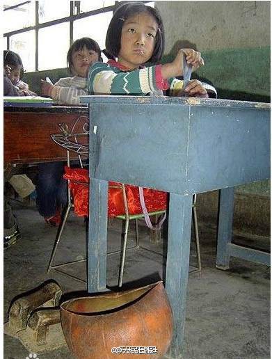 Qian Hongyan listens to the teacher. Beside the desk were the basketball used to cover the bottom of her upper body and two wooden blocks, which were used to help her to 'walk' by hands. (Photo/weibo.com)