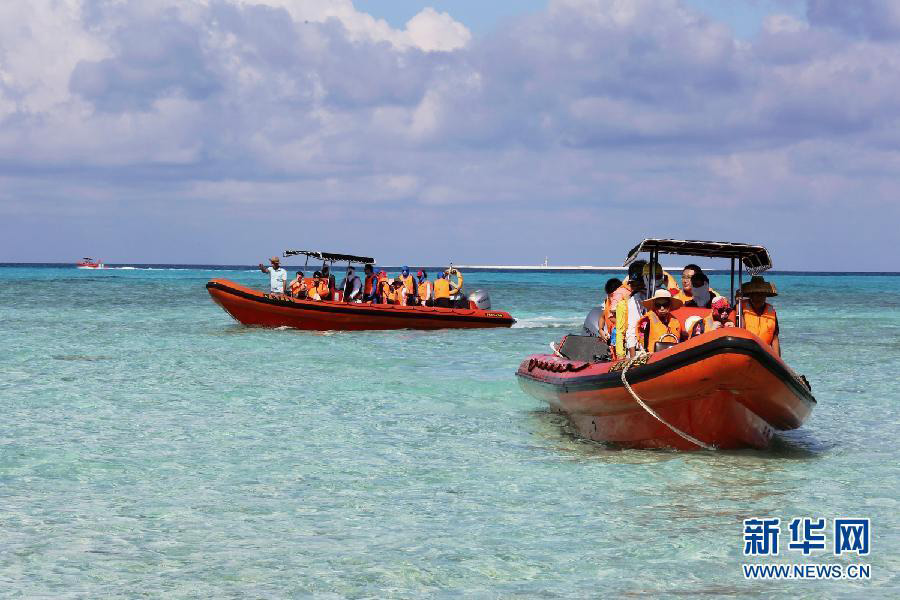 Tourists take a trip to Yinyu Island by speedboats, Sept. 3, 2014. (Photo/Xinhua News Agency)