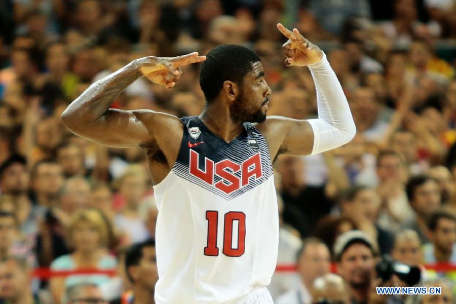 Kyrie Irving of the United States celebrates during the semifinal match with Lithuania at the 2014 FIBA Basketball World Cup Spain in Barcelona Sept. 11, 2014. The United States won 96-68. (Xinhua/Pau Barrena)