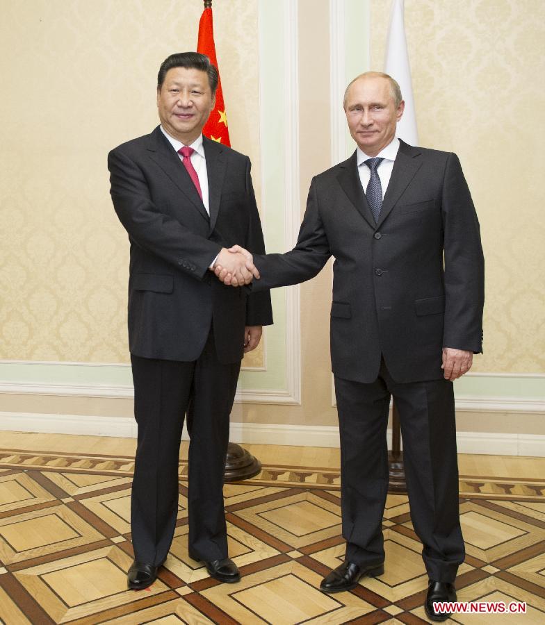 Chinese President Xi Jinping (L) meets with his Russian counterpart Vladimir Putin in Dushanbe, capital of Tajikistan, Sept. 11, 2014. (Xinhua/Huang Jingwen)