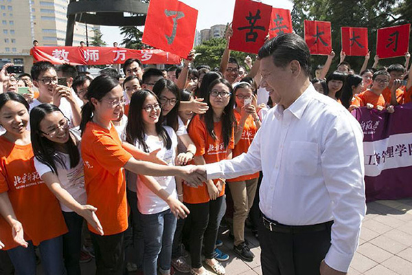 President Xi Jinping warmly shakes hands with people in Beijing Normal University. (Xinhua/Pang Xinglei)