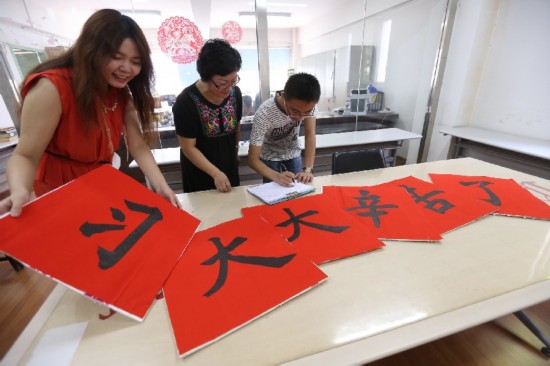 Students in Beijing Normal University design a sign together. (People's Daily Online/Lin Hui) |