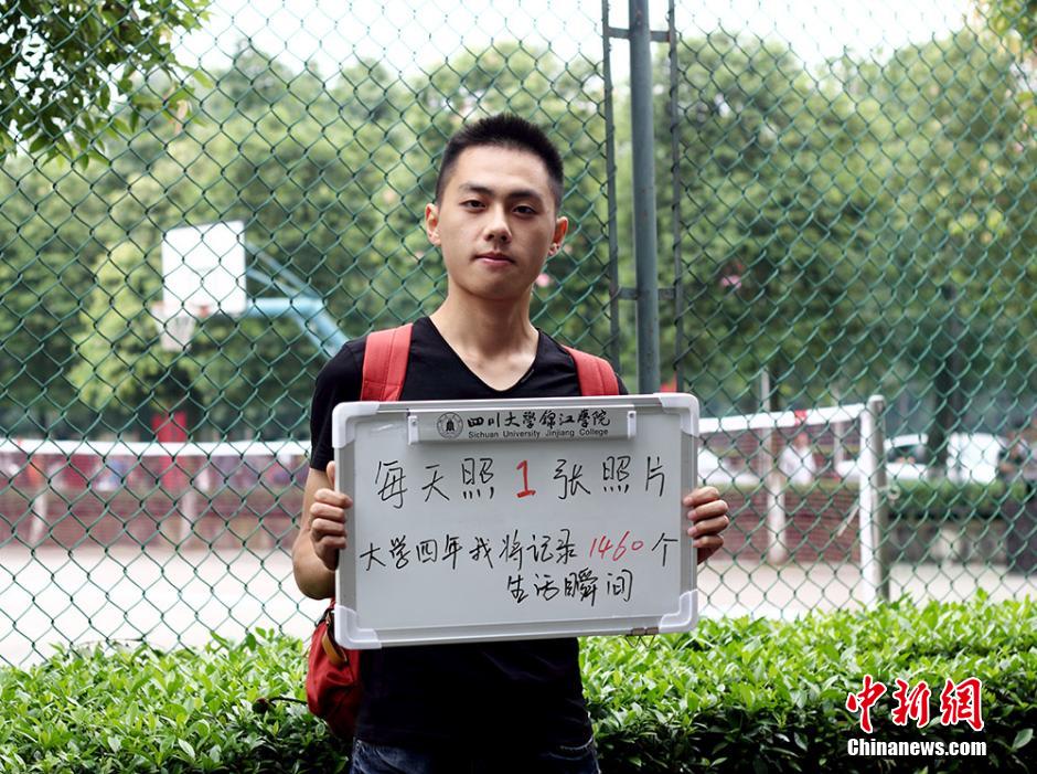 The board reads: "Taking one picture per day, I'll have 1,460 photos in four years." (Chinanews/Xu Yaling)