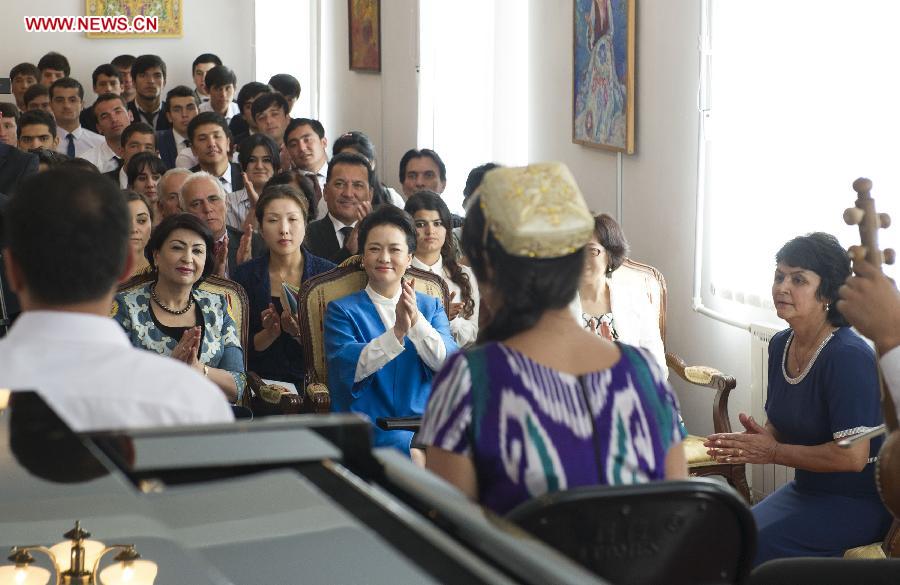 Chinese President Xi Jinping's wife Peng Liyuan watches performance of teachers and students at Tajikistan state college of music arts in Dushanbe, capital of Tajikistan, Sept. 12, 2014. (Xinhua/Huang Jingwen)