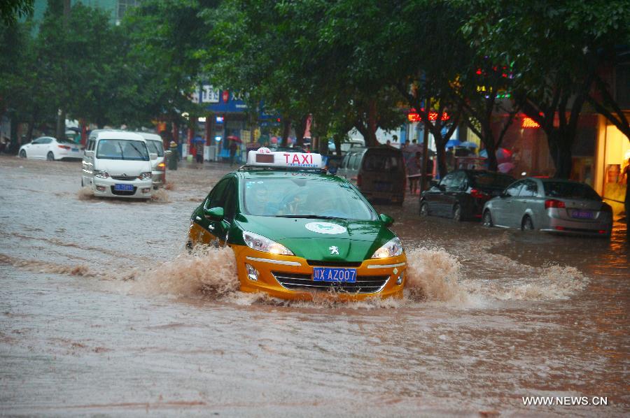 A taxi braves water to pass a flooded road in Guang'an City, southwest China's Sichuan Province, Sept. 13, 2014. A persistent rainfalll hit Guang'an from early morning of Sept. 13, causing serious urban waterlogging and flooding some croplands. Relief works are underway. (Xinhua/Zhang Guosheng)