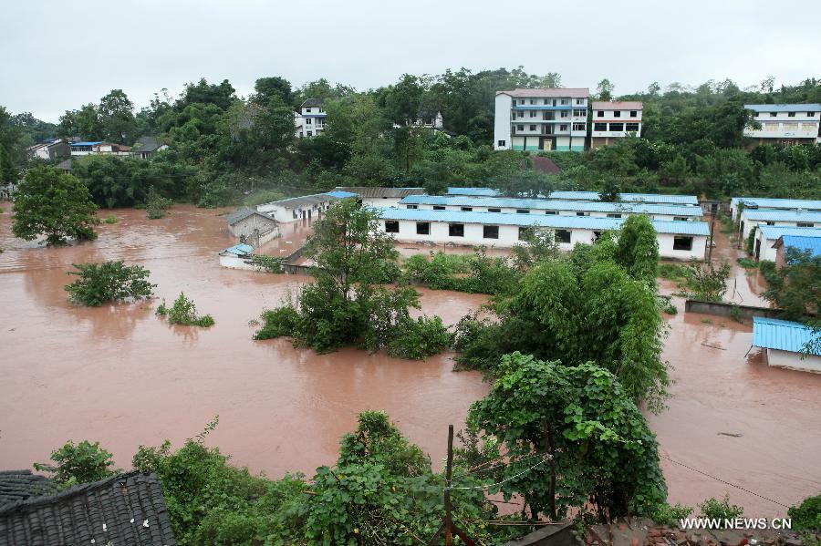 Flood immerses Chaqi Village of Zaoshan Township in Guang'an City, southwest China's Sichuan Province, Sept. 13, 2014. A persistent rainfalll hit Guang'an from early morning of Sept. 13, causing serious urban waterlogging and flooding some croplands. Relief works are underway. (Xinhua/Liao Xiaobing)