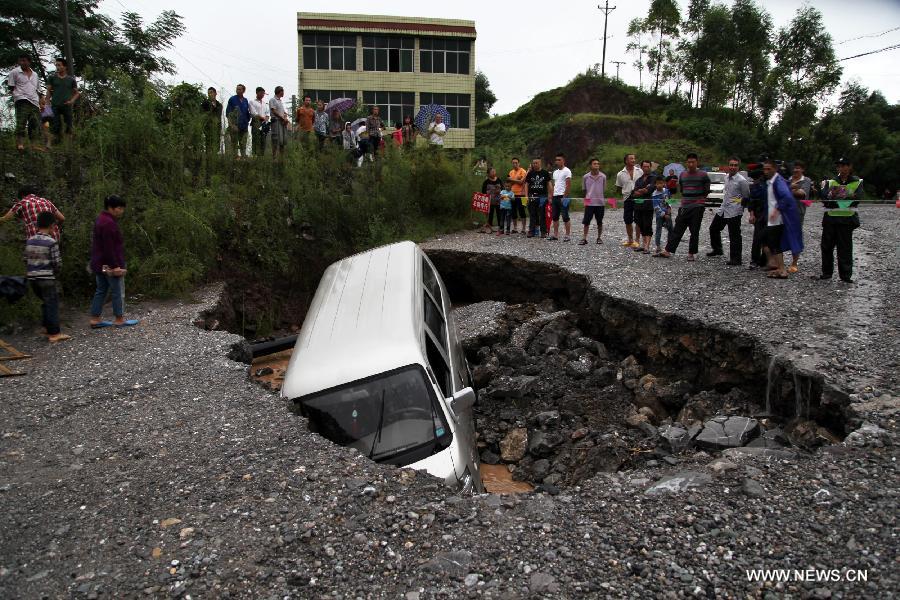 A minivan falls into a pit caused by flood in Guang'an City, southwest China's Sichuan Province, Sept. 13, 2014. A persistent rainfalll hit Guang'an from early morning of Sept. 13, causing serious urban waterlogging and flooding some croplands. Relief works are underway. (Xinhua/You Qing)