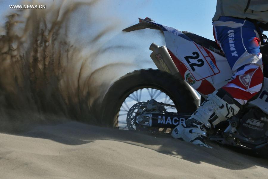 A pilot takes part in the second leg of the Inca Challenge 2014 of the Dakar series in Paracas, province of Pisco, Peru, on Sept. 13, 2014. (Xinhua/Oscar Farje Gomero/Andina)
