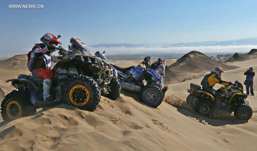 Pilots take part in the second leg of the Inca Challenge 2014 of the Dakar series in Paracas, province of Pisco, Peru, on Sept. 13, 2014. (Xinhua/Oscar Farje Gomero/Andina)