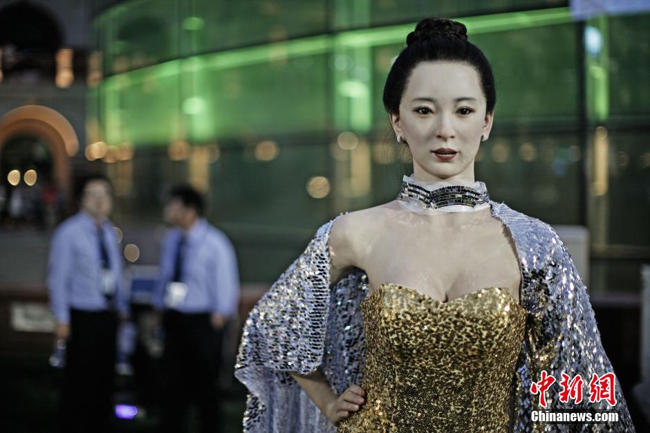 A robot “beauty” attracts much attention at the Davos forum in Tianjin Minyuan Stadium where the cultural night of the Dovos 2014 summer Forum is held. Guests from home and abroad experienced the charm of Tianjin by tasting local foods and enjoying artistic performances. (Chinanews.com/Tong Yu)