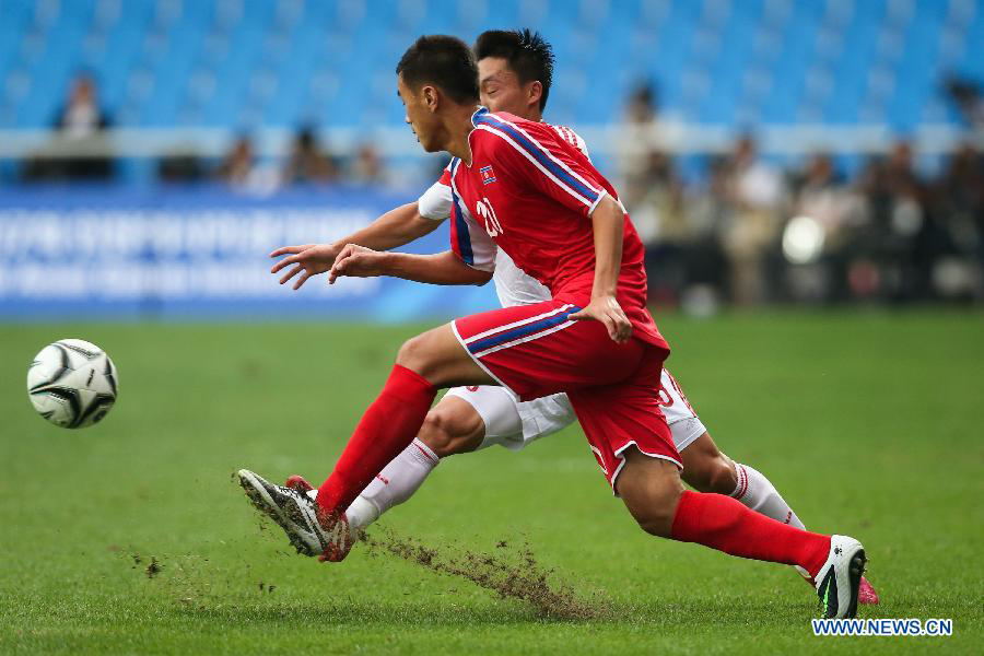 So Kyongjin (front) of the Democratic People's Republic of Korea (DPRK) competes during the men's football first round group F match against China at the 17th Asian Games in Incheon, South Korea, on Sept. 15, 2014. (Xinhua/Zhang Fan)