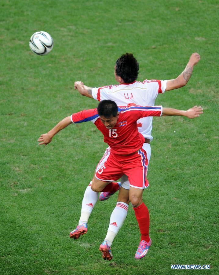 Ri Hyokchol (front) of the Democratic People's Republic of Korea (DPRK) vies for the ball during the men's football first round group F match against China at the 17th Asian Games in Incheon, South Korea, on Sept. 15, 2014. (Xinhua/Huang Zongzhi)