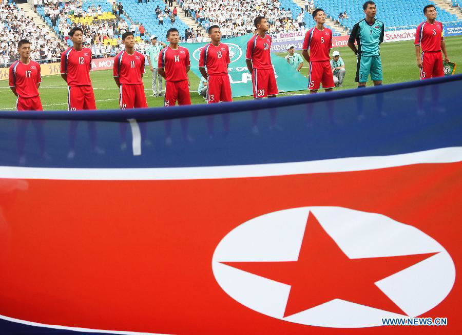 Players of the Democratic People's Republic of Korea (DPRK) react before the men's football first round group F match against China at the 17th Asian Games in Incheon, South Korea, on Sept. 15, 2014. (Xinhua/Zhang Fan)