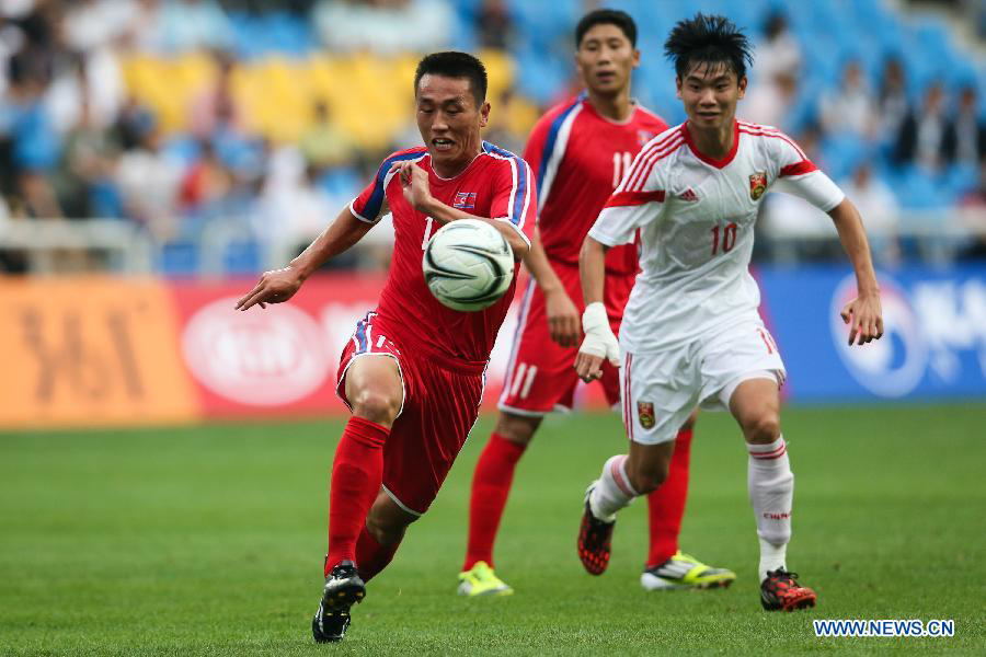 Sim Hyonjin (L) of the Democratic People's Republic of Korea (DPRK) competes during the men's football first round group F match against China at the 17th Asian Games in Incheon, South Korea, on Sept. 15, 2014. (Xinhua/Zhang Fan)