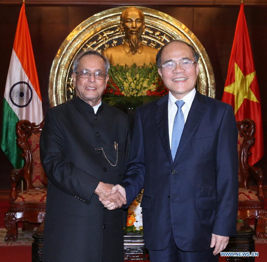 Vietnamese National Assembly (NA) Chairman Nguyen Sinh Hung (R) shakes hands with Indian President Pranab Mukherjee in Hanoi, capital of Vietnam, Sept. 15, 2014. Indian President Pranab Mukherjee paid a state visit to Vietnam from Sept. 14 to 17. (Xinhua/VNA)